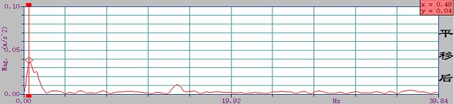 平移后的測試結(jié)果:根據(jù)實測的實時譜曲線,平移后二層樓面振動測點(diǎn)的主頻為0.49HZ(振動周期2.04s)。