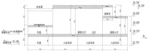 根據(jù)經(jīng)營要求,建筑物東側(cè)單體需進(jìn)行加層改造,加層后,原五層頂屋面變?yōu)榱鶎樱鳛檐噹旎蚪?jīng)營使用,原五層新世紀(jì)影城搬遷至新建七層。加層設(shè)計(jì)時(shí),結(jié)構(gòu)標(biāo)高布置需在滿足影廳凈高要求的同時(shí)兼顧新加樓層與周邊建筑物車道的交通銜接、屋頂涼水塔、影院放映廳、已有樓梯、電梯等,平面、剖面布置較為復(fù)雜,剖面見圖2。