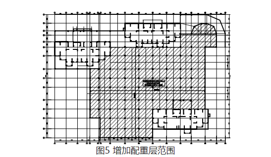 根據(jù)建筑完工后總平面中的場地最低點,抗浮設計水頭按4.5m對車庫部分結構進行復核驗算,復核驗算內(nèi)容包括整體抗浮計算和局部抗浮計算。結合驗算結果及現(xiàn)場檢測情況,在車庫現(xiàn)有地面上增設20cm厚混凝土層,如圖5中陰影所示。