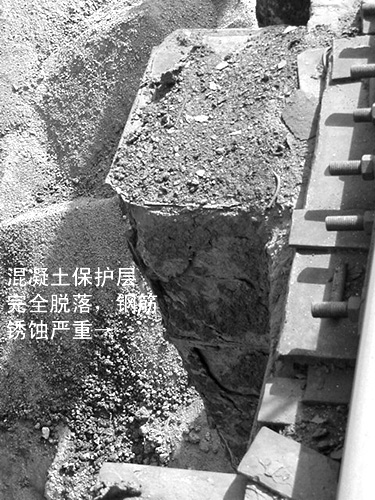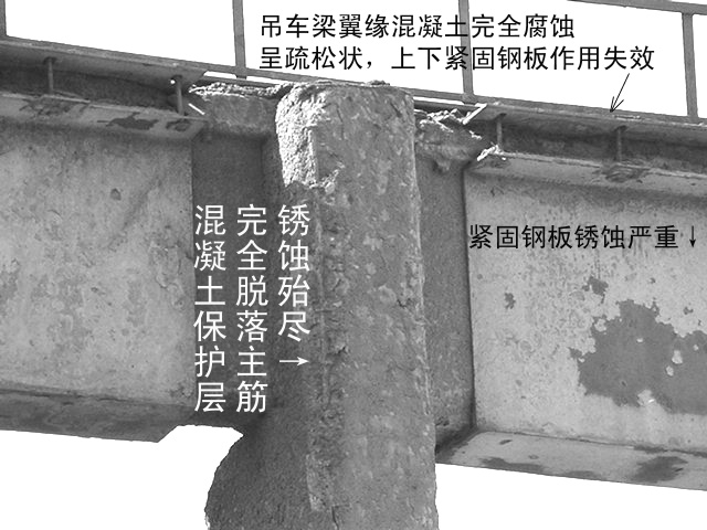 濟(jì)南鋼鐵廠除渣車間,吊車梁鋼筋銹蝕,混凝土疏松。通過我所對其進(jìn)行鑒定及加固,滿足了安全使用要求。