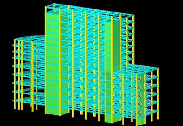 邢臺銀座商城,由于商場布局改變,要求拆除9軸線上J~K間250mm厚混凝土墻(1~5層),J軸線上8~9間250mm厚混凝土墻(1~5層)。拆除該位置墻體造成結(jié)構整體剛度不均勻,扭轉(zhuǎn)效應增大。為了不影響商場的使用功能,選擇在其他部位增加耗能鋼支撐的方法解決剛度中心的偏移。